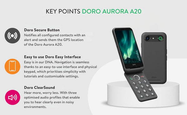The Doro Aurora A10, A20 and A30 are the latest additions to Doro’s smartphone lineup designed specifically for simplicity, safety and accessibility, each offering the core Doro features like the one-touch Secure Button, ClearSound audio tuning and a simplified Android interface; the A10 is the most compact and practical option with a modest 4.5″ screen and balanced performance suited to everyday needs, the A20 retains the same screen size but adds a more tactile experience with a built-in physical keypad and slightly enhanced usability, while the A30 stands out with a significantly larger 6.1″ display, higher-resolution camera system and greater memory and battery capacity for smoother multitasking and richer media use.
